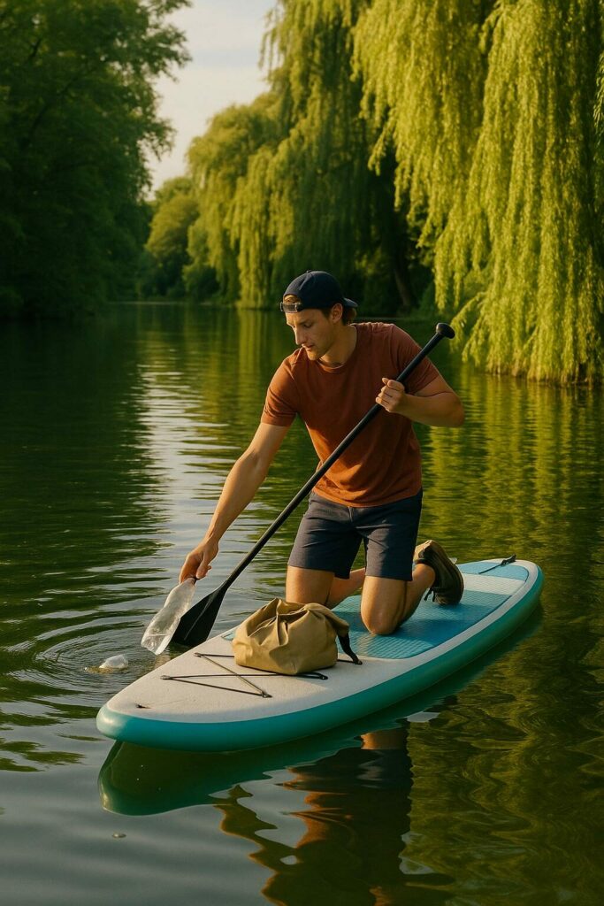 - Sei ein Wasserschutz-Held: Müll einsammeln: Wenn du auf deiner Tour Müll auf dem Wasser treiben siehst und es sicher möglich ist, versuche ihn einzusammeln. Bring ihn zurück zu uns – wir haben Behälter für die fachgerechte Entsorgung.